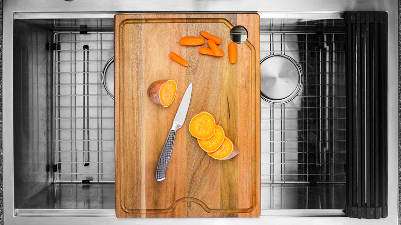 If you’re unable to locate a cutting board that fits perfectly around your sink, consider getting one designed for your stovetop instead. These boards come in various sizes; some will span across only two burners, while others can cover all four. Just keep in mind that when this board is placed over the stove, you won’t be able to use the cooking elements underneath—another trade-off for additional preparation area. After completing your chopping tasks, simply remove the board and return your sink or stove back to their original functions without hassle.